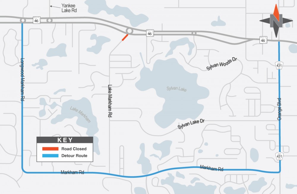 A continuous road closure and detour of Lake Markham Road at State Road (S.R.) 46 is planned to start as early as 8 p.m. on Sunday, October 31, as part of the Wekiva Parkway (S.R. 429) project. The closure will be in place for approximately two months.