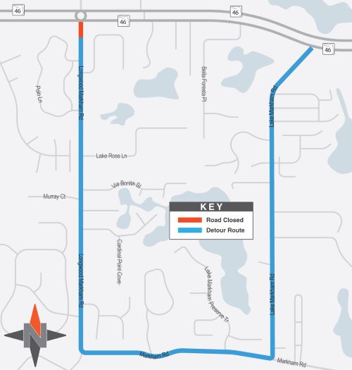 A continuous road closure and detour of Longwood Markham Road at State Road (S.R.) 46 is planned to start as early as 8 p.m. on Wednesday, September 15, as part of the Wekiva Parkway (S.R. 429) project. The closure will be in place for approximately two months.