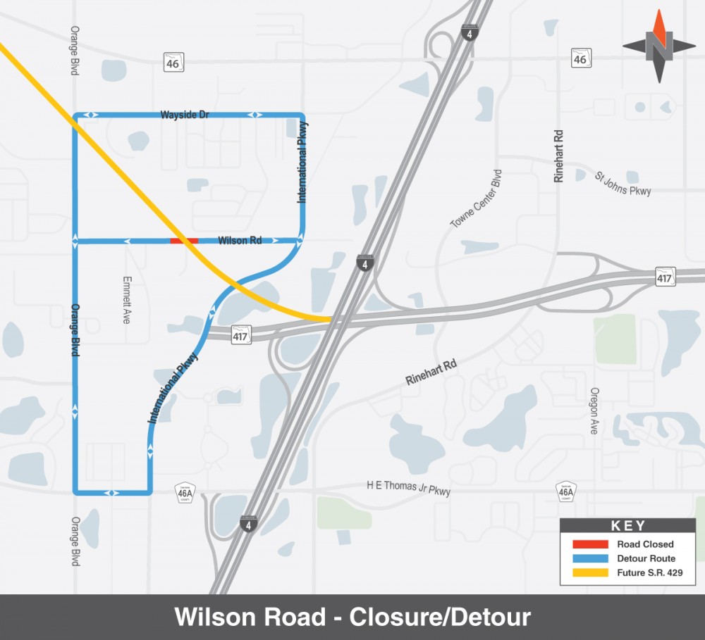 Motorists should use S.R. 417 to Rinehart Road to S.R. 46 or Wilson Road to Orange Boulevard as alternate routes.