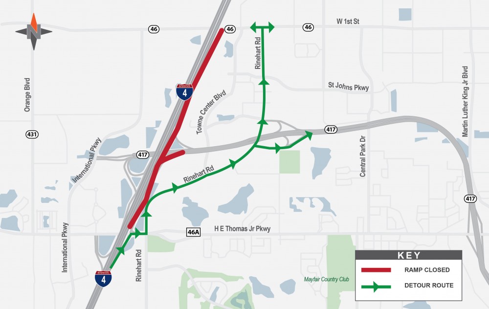 - Northbound S.R. 417 to westbound I-4, 8:30 p.m. – 6 a.m.: Use Rinehart Road to C.R. 46A