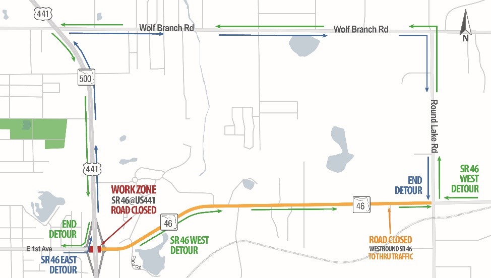 S.R. 46 between Round Lake Road and U.S. 441 at night will be open to local traffic only. Electronic message boards are in place and law enforcement officers will be on site to help direct drivers. Please note this schedule may change due to weather or other unexpected conditions.