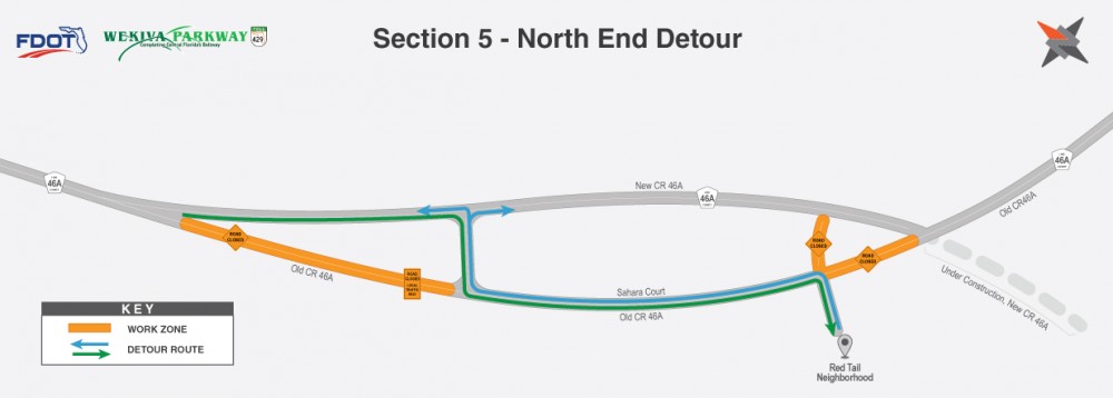 Access to the Red Tail community has been detoured through a temporary access road to allow crews to build the new entrance connection to the new C.R. 46A. Electronic message boards have been posted. Please be advised that weather or other unexpected conditions could delay or prolong work.