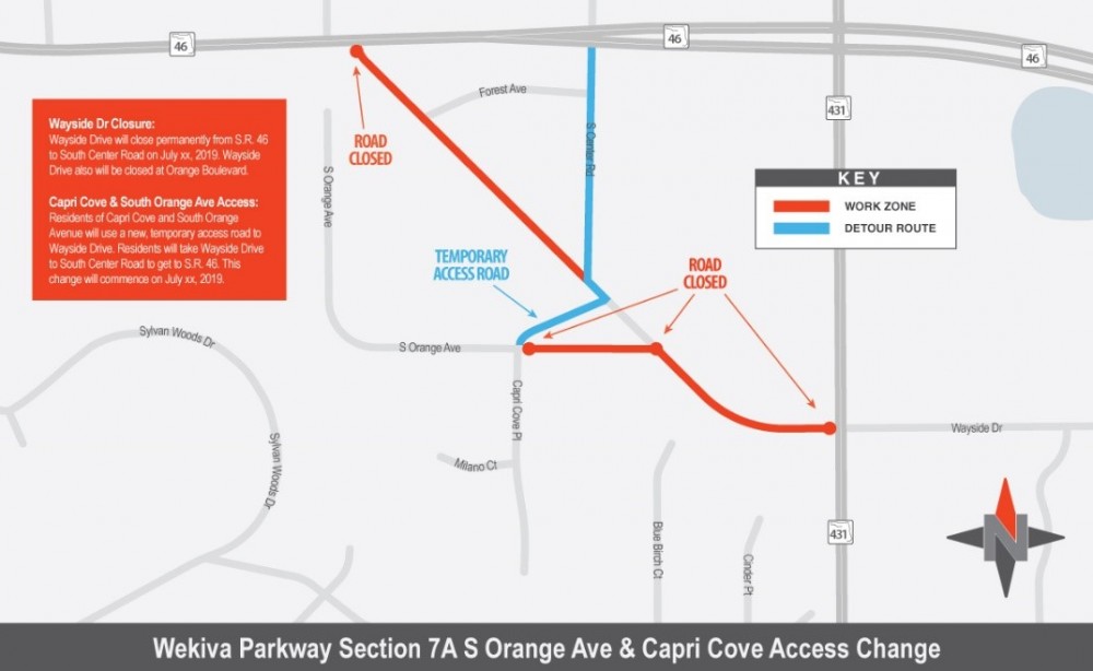 Capri Cove and South Orange Avenue Access: Residents of Capri Cove and South Orange Avenue will use a temporary access road to Wayside Drive. Residents will take Wayside Drive to South Center Road to get to S.R. 46. This change will begin on July 23, 2019. This will allow the new, permanent side street connection to Orange Boulevard to be built.