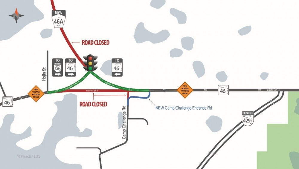 The lane closures are needed for paving and striping. Once that work is complete, S.R. 46 traffic will shift onto a new alignment near Camp Challenge Road (see green route on map below). The new traffic pattern will require motorists to stop at a flashing traffic signal at a new T-intersection before continuing on S.R. 46. The change also provides new S.R. 46 access to Camp Challenge Road.