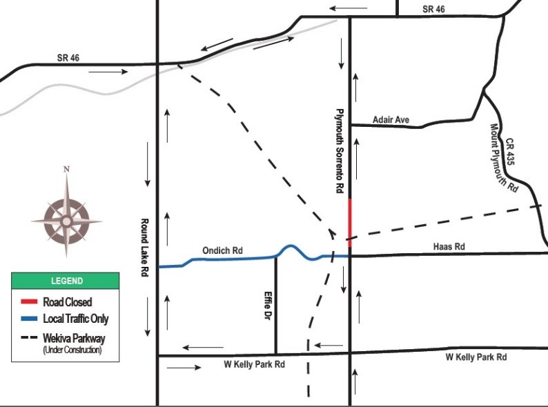 During the closures, traffic will be detoured via Effie Drive, Kelly Park Road and Plymouth Sorrento Road. Flaggers will direct traffic and electronic message boards are posted to alert drivers. Bad weather or other unforeseen circumstances could delay or prolong work. Motorists are urged to use caution in the construction area for their safety and that of the work crews.