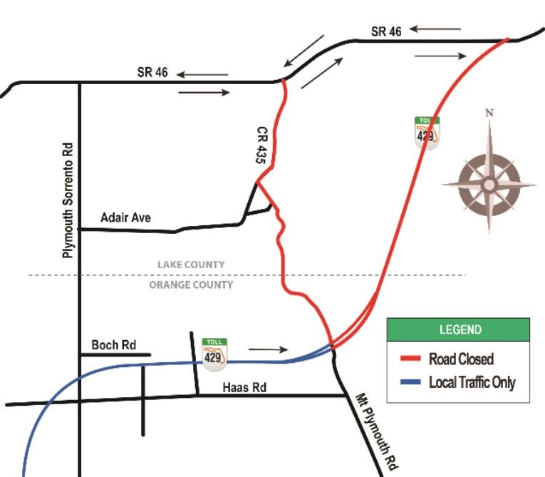 During the closure, through traffic will be detoured to SR 46, Plymouth Sorrento Road and Haas Road. Local access to CR 435 north of SR 429 will remain available. Access to northbound SR 429 will remain open during this operation.