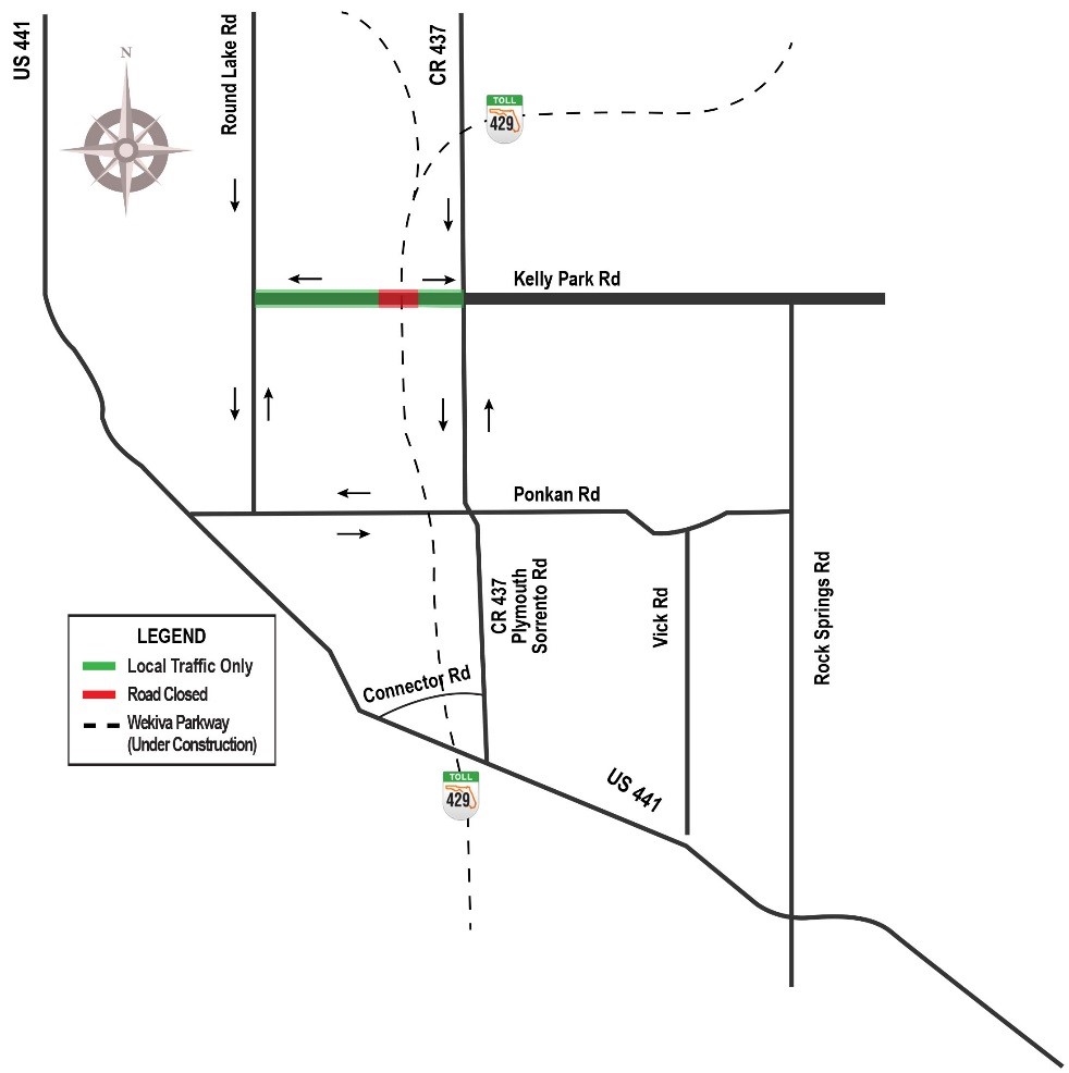 (APOPKA, FL) – On Thursday, December 15 and Friday, December 16, crews are scheduled to close Kelly Park Road between Round Lake Road and Plymouth Sorrento Road as part of building the Wekiva Parkway (State Road 429). The closure from 8:30 a.m. – 4:30 p.m. will allow crews to pave and stripe Kelly Park Road.