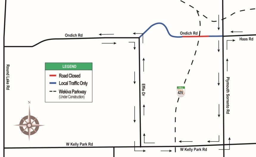 (APOPKA, FL) -- Crews building part of the Wekiva Parkway (State Road 429) are scheduled to close Ondich Road west of Plymouth Sorrento Road. The closures and detours scheduled for Tuesday, November 22, from 7 a.m. - 6 p.m. and Wednesday, November 23, 7 a.m. – 12 p.m. This will allow crews to install bridge beams.