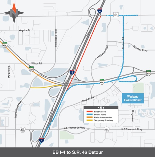 • Eastbound I-4 ramp system to S.R. 46: Use southbound S.R. 417 to Rinehart Road