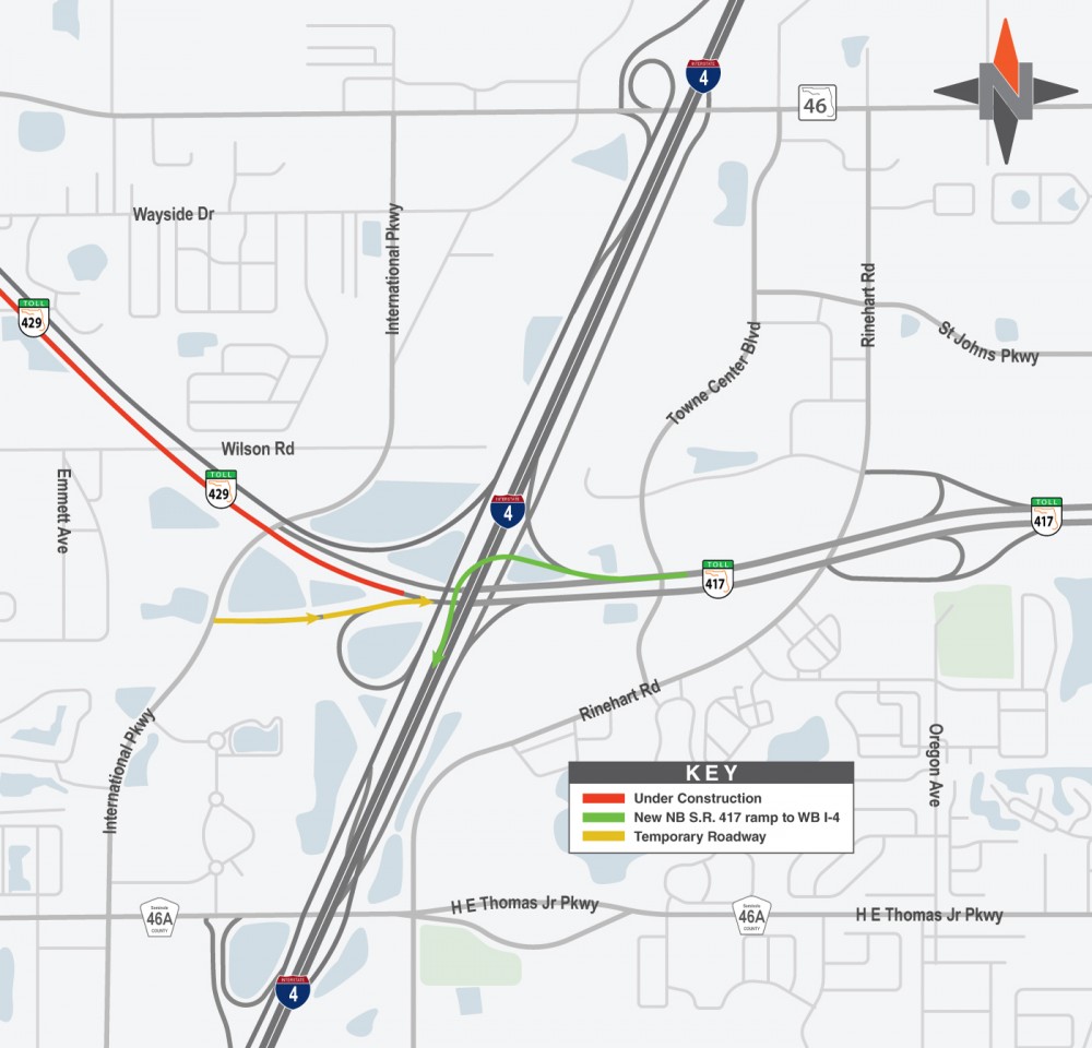 - Northbound S.R. 417 to International Parkway westbound/eastbound I-4 (8:30 p.m. – 6 a.m.): Use Rinehart Road to S.R. 46 or C.R. 46A