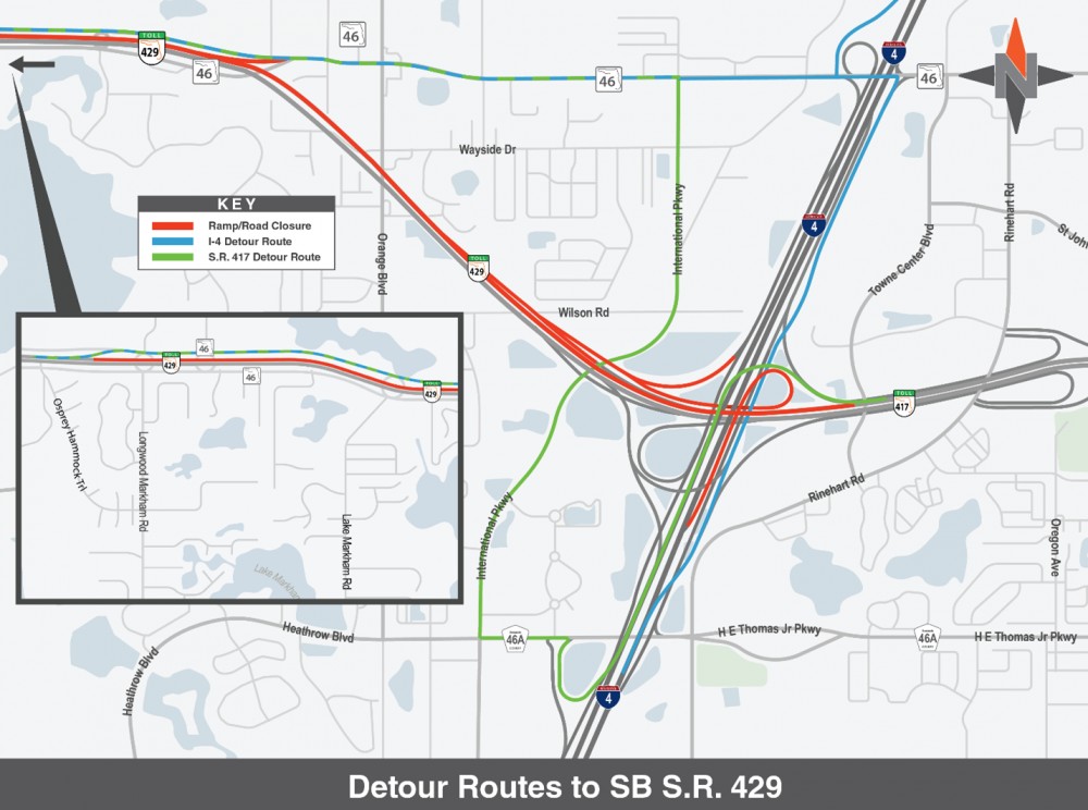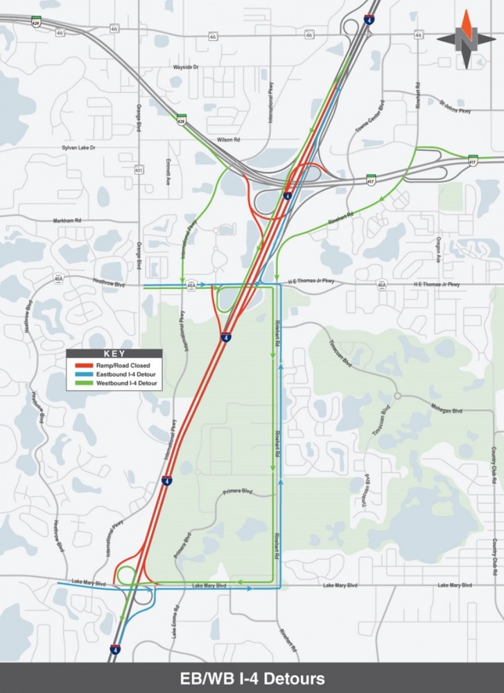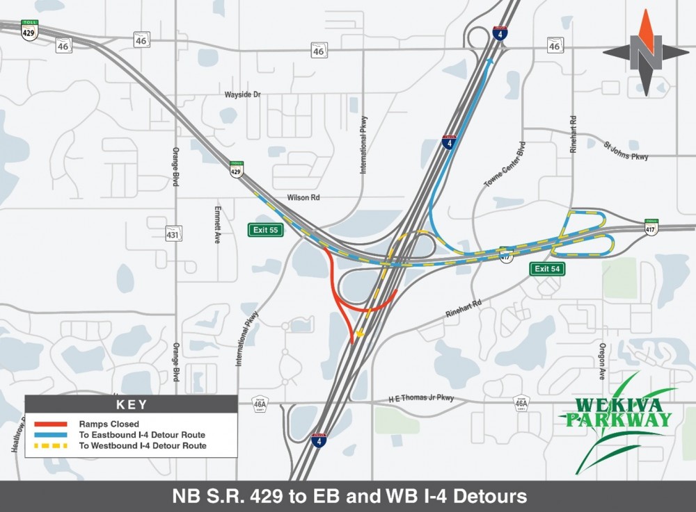 - Northbound S.R. 429 to westbound I-4 (10 p.m. – 4 a.m.): Use southbound International Parkway to C.R. 46A east, then south to Rinehart Road, and west on Lake Mary Boulevard to access westbound I-4.