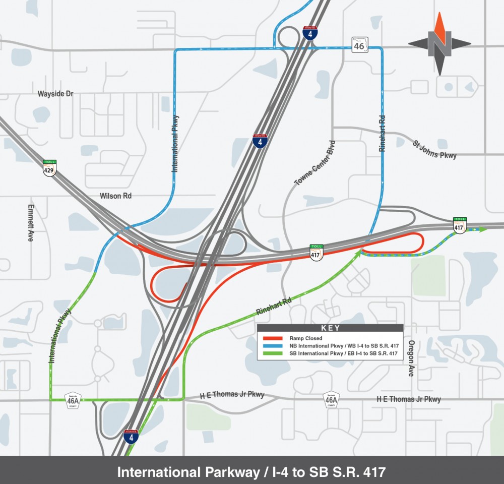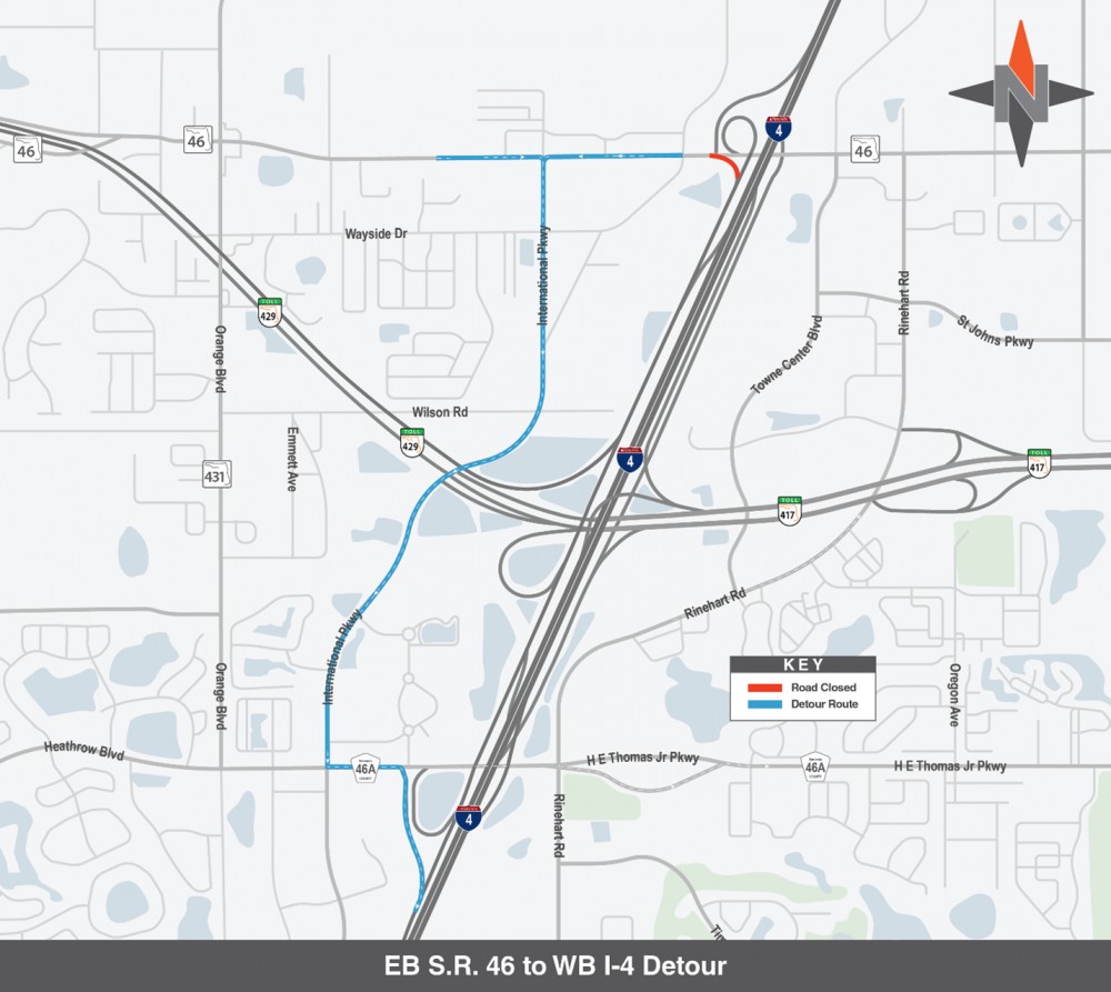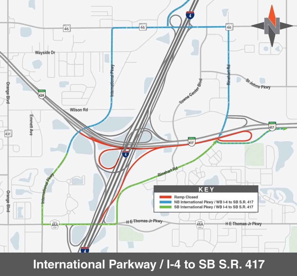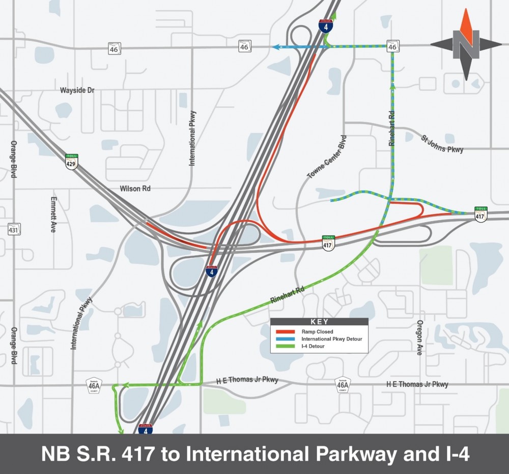 - Northbound S.R. 417 to International Parkway and westbound/eastbound I-4 (8:30 p.m. – 6 a.m.): Use Rinehart Road to S.R. 46 or C.R. 46A
