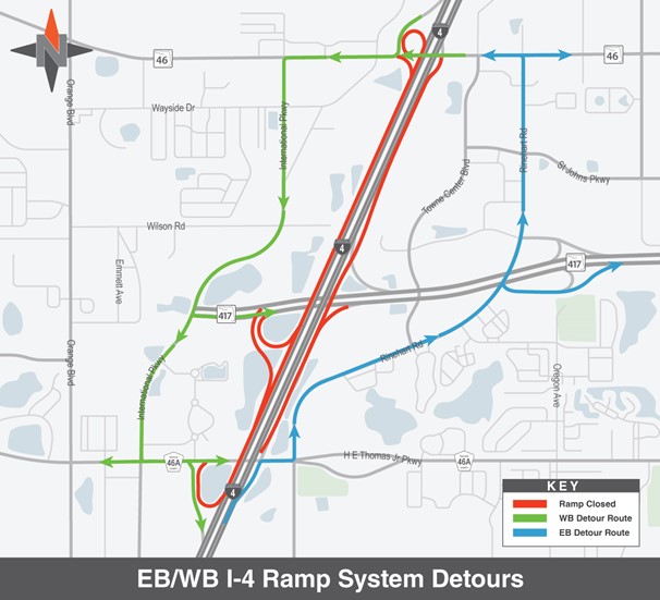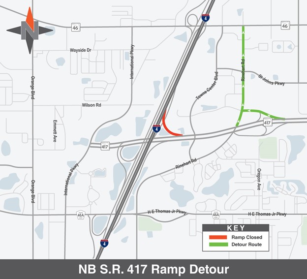 · Motorists headed northbound on S.R. 417 to eastbound I-4 will be detoured to northbound Rinehart Road to S.R. 46.