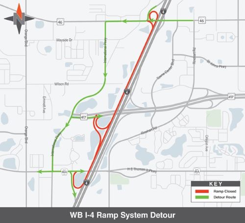 - Westbound I-4 ramp system to southbound S.R. 417 and C.R. 46A (8 p.m. – 6 a.m.): Use International Parkway to C.R. 46A