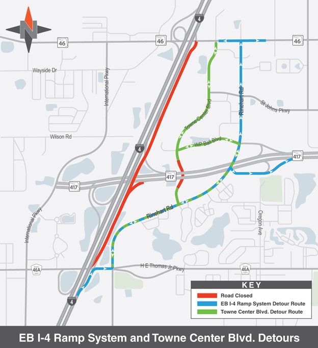 - Westbound I-4 to southbound S.R. 417 (8 p.m. – 6 a.m.): Use I-4 to County Road (C.R.) 46A to Rinehart Road