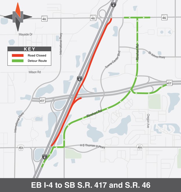 - Eastbound I-4 to southbound S.R. 417 and S.R. 46 (8 p.m. – 6 a.m.): Use Rinehart Road