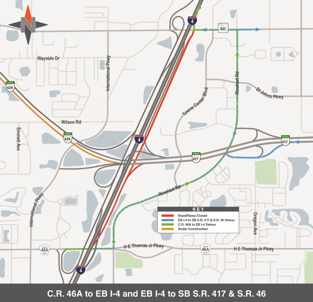 - C.R. 46A to eastbound I-4 (7:30 p.m. – 6 a.m.): Use Rinehart Road to S.R. 46