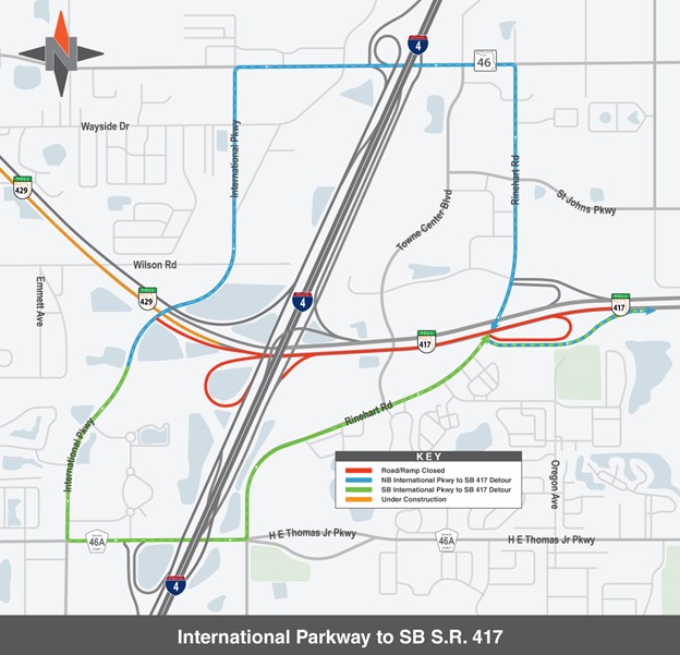 - International Parkway to southbound S.R. 417 (8 p.m. – 6 a.m.): Use S.R. 46 or C.R. 46A to Rinehart Road