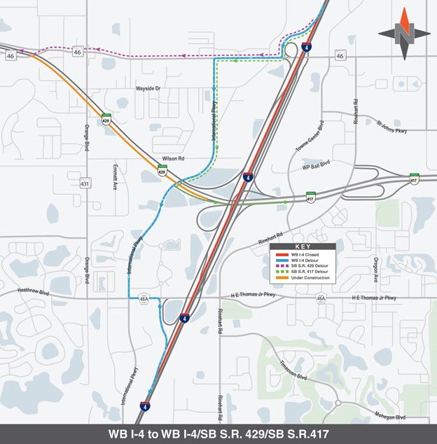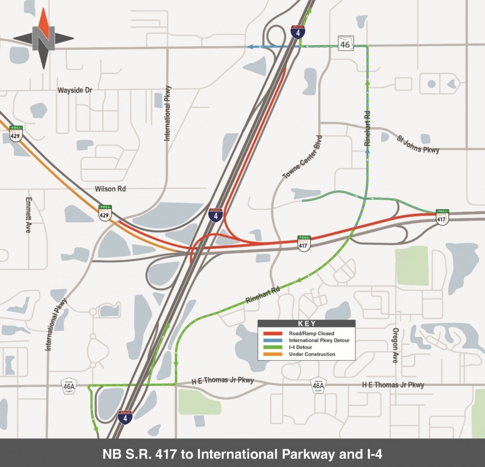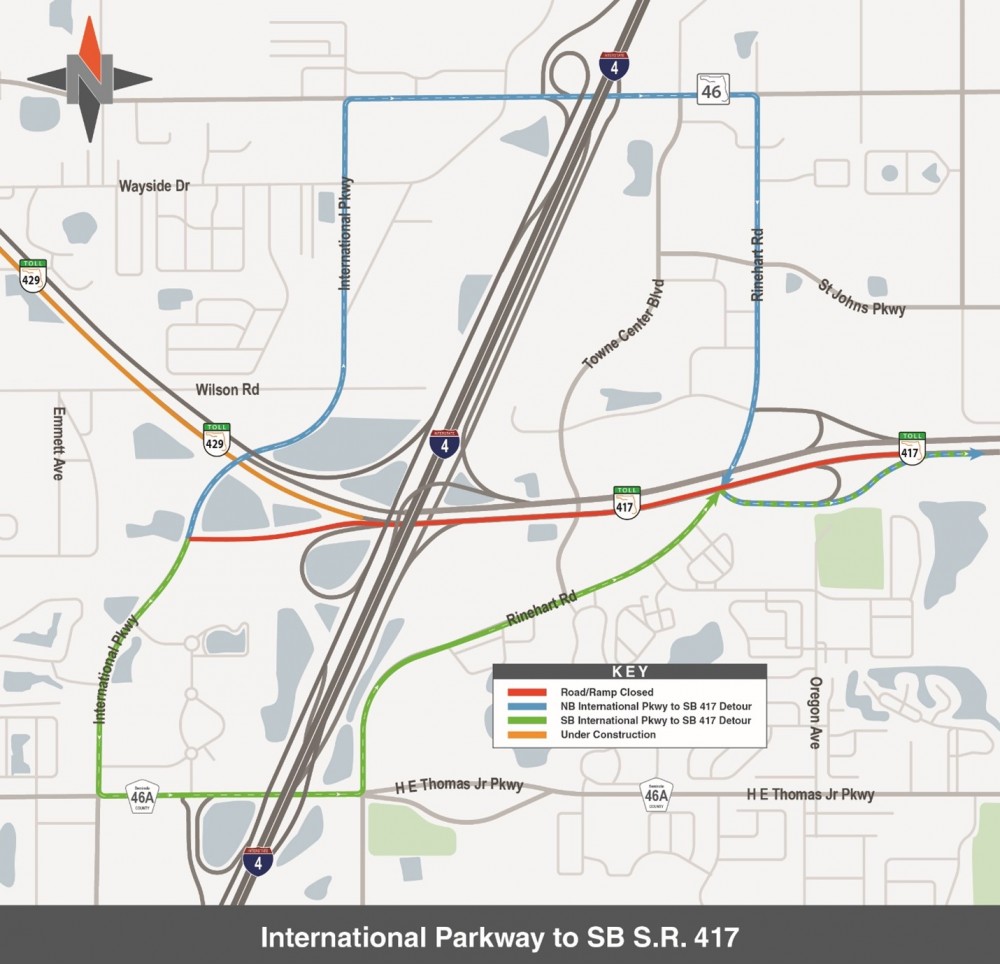 - Northbound S.R. 417 to International Parkway and westbound/eastbound I-4 (8:30 p.m. – 6 a.m.): Use Rinehart Road to S.R. 46 or C.R. 46A