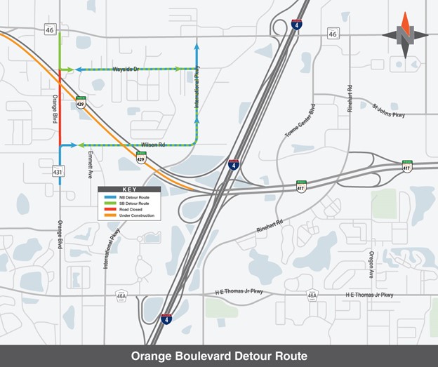 - Northbound Orange Boulevard to S.R. 46: Use Wayside Drive to International Parkway to S.R. 46