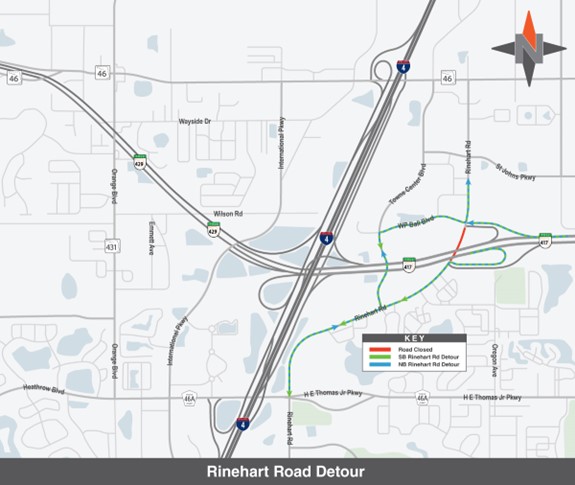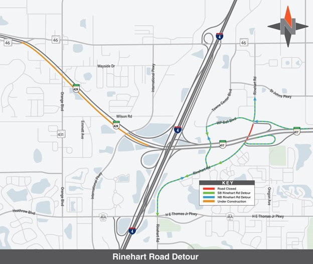 - Northbound Rinehart Road at S.R 417 (7:30 p.m. – 6 a.m.): Use WP Ball Boulevard to Rinehart Road