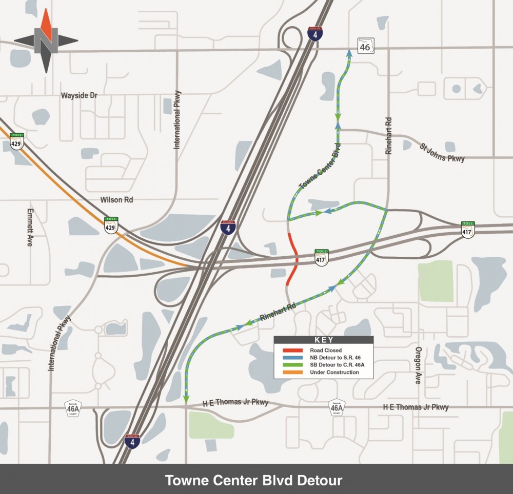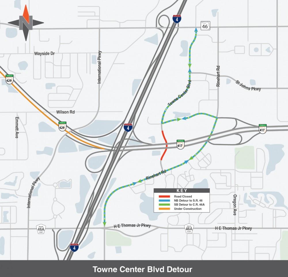 - Southbound Towne Center Boulevard at S.R. 417 (7 p.m. – 6 a.m.): Use WP Ball Boulevard to Rinehart Road