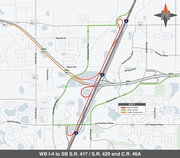 - Westbound I-4 to SB S.R 417 (12 a.m.-5 a.m.): Use S.R 46, then International Parkway