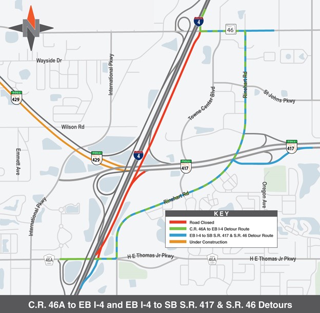 - Northbound S.R. 417 to International Parkway westbound/eastbound I-4 (8:30 p.m. – 6 a.m.): Use Rinehart Road to S.R. 46 or C.R. 46A