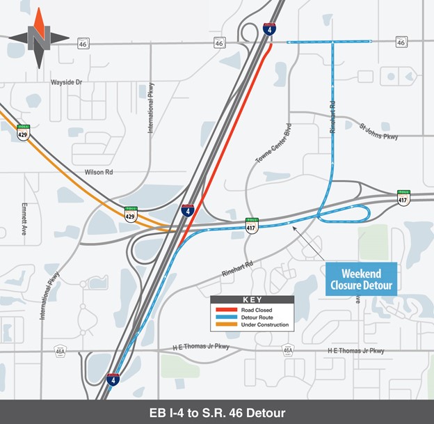 - Eastbound I-4 ramp system to S.R. 46 (8 p.m. – 6 a.m.): Use S.R. 417 to Rinehart Road