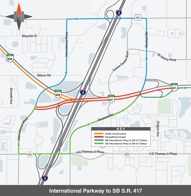 · Northbound S.R. 417 to International Parkway westbound/eastbound I-4 (8:30 p.m. – 6 a.m.): Use Rinehart Road to S.R. 46 or C.R. 46A
