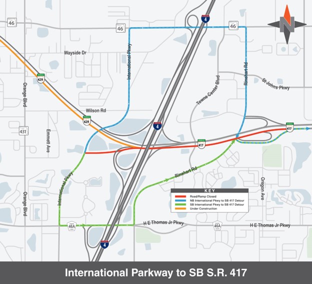 - International Parkway to southbound S.R. 417 (8 p.m. – 6 a.m.): Use S.R. 46 or C.R. 46A to Rinehart Road