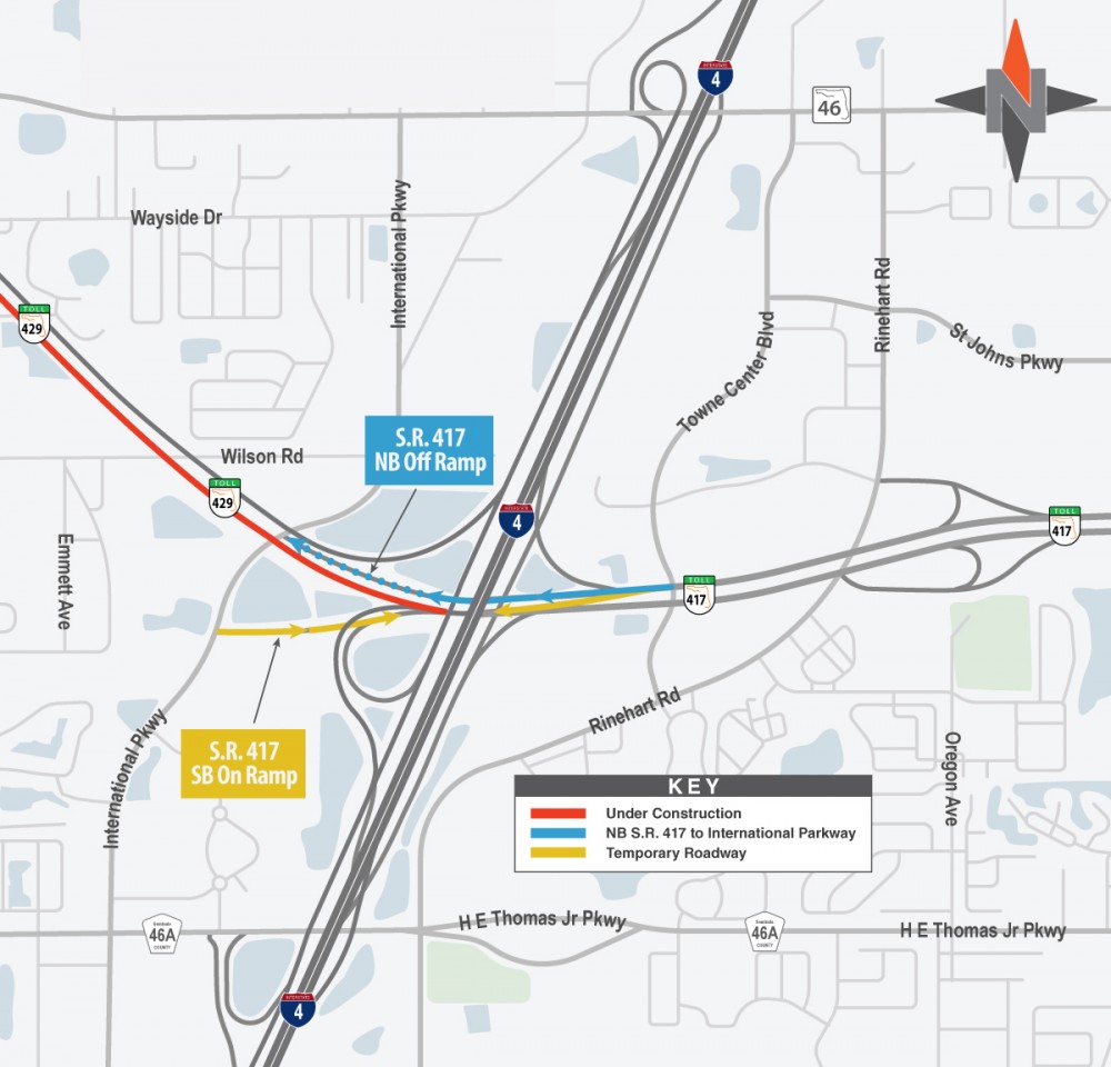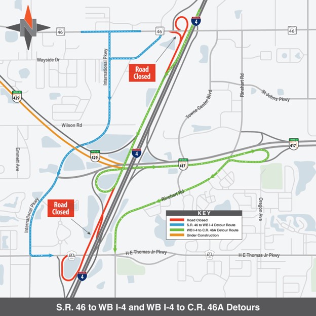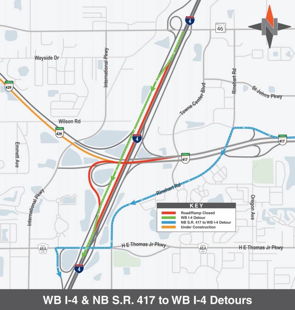 - Northbound S.R. 417 to westbound I-4 (12 a.m. – 3 a.m.): Use Rinehart Road to C.R. 46A