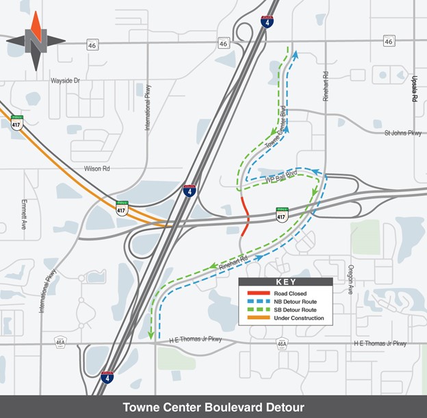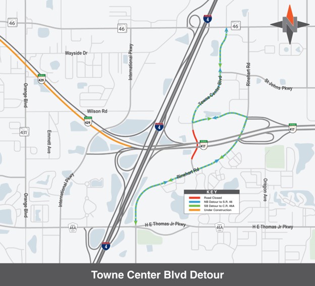 - Southbound Towne Center Boulevard at S.R. 417 (7 p.m. – 6 a.m.): Use WP Ball Boulevard to Rinehart Road