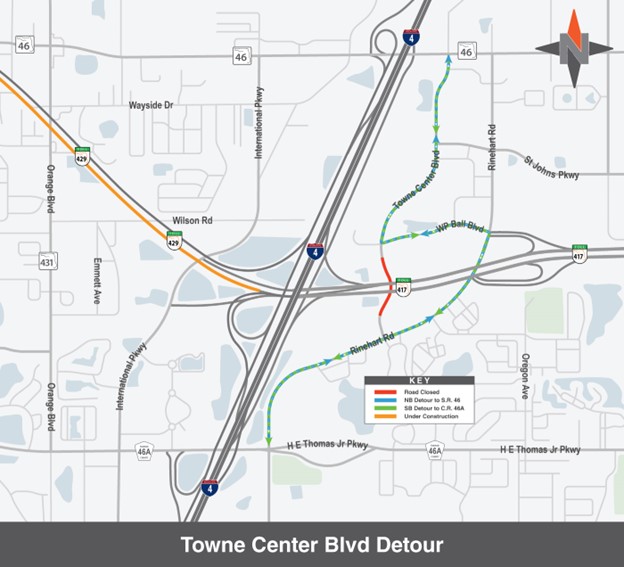 - Northbound Towne Center Boulevard at S.R 417 (7 p.m. – 6 a.m.): Use Rinehart Road to WP Ball Boulevard