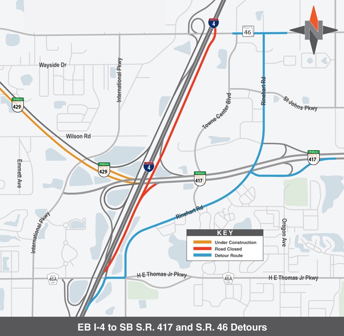 - Eastbound I-4 ramp system to southbound S.R. 417 and S.R. 46 (8 p.m. – 6 a.m.): Use Rinehart Road