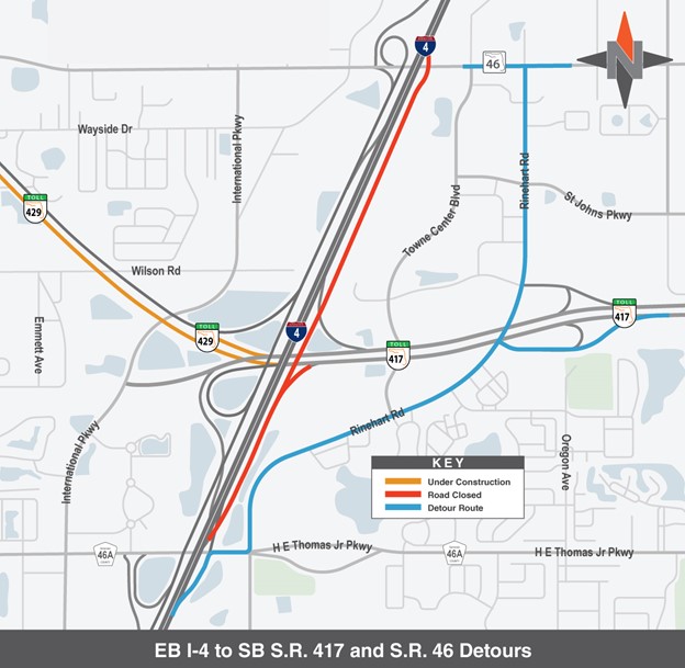 · Westbound I-4 to southbound S.R. 417 (8 p.m. – 6 a.m.): Use I-4 to County Road (C.R.) 46A to Rinehart Road