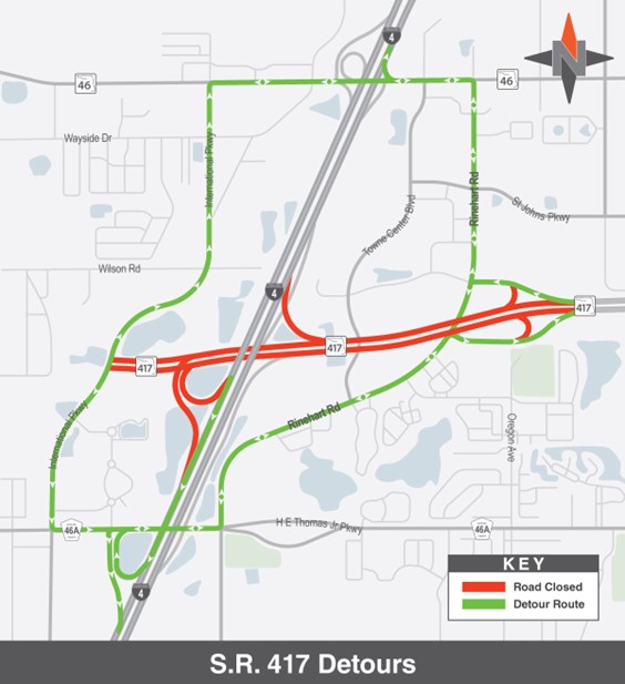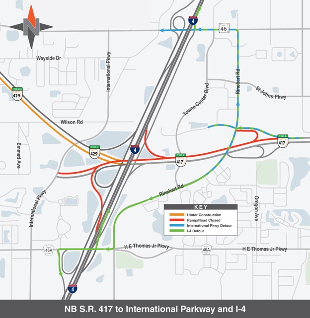 - Northbound S.R. 417 to International Parkway westbound/eastbound I-4 (8:30 p.m. – 6 a.m.): Use Rinehart Road to S.R. 46 or Cr. Road 46A